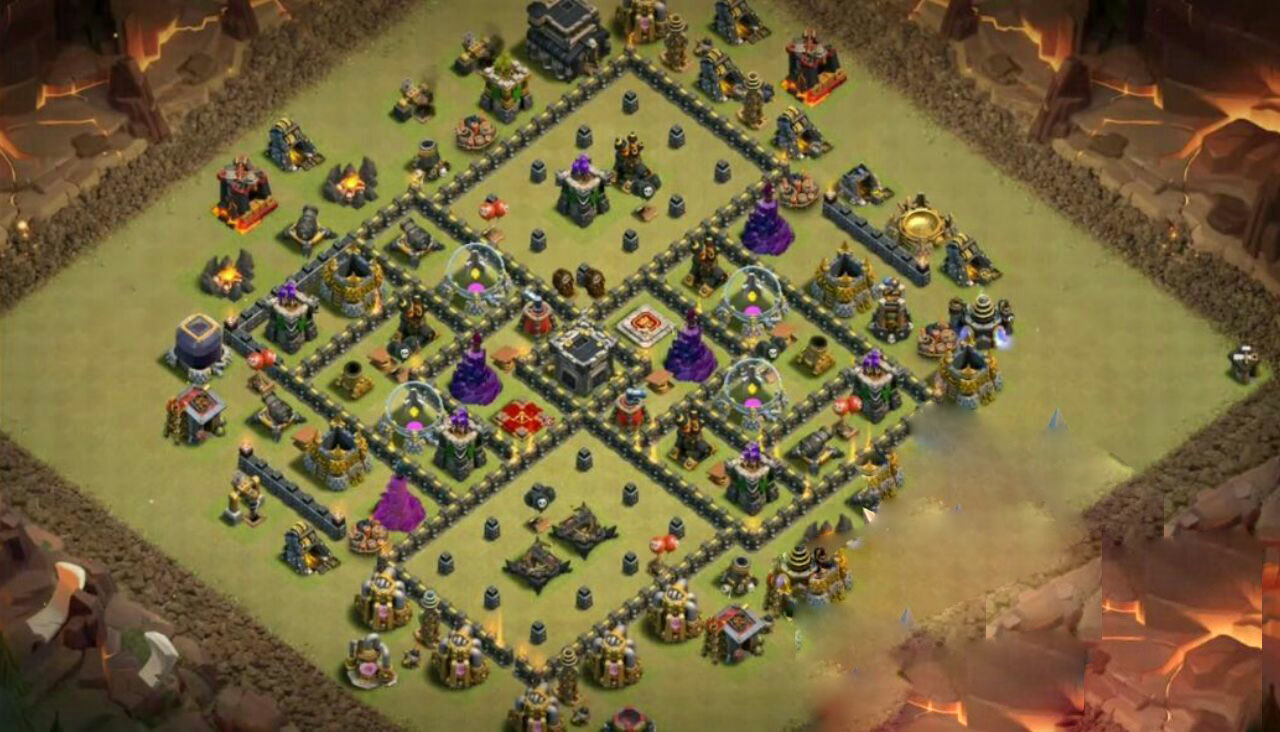 این مپ تاون 9 بازی کلش اف کلنز با قرار دادن تاون هال در کنار زمین و قرار دادن کلن کستل در مرکز احتمال سه ستاره شدن این مپ توسط حریفان را یه شدت کاهش داده است.